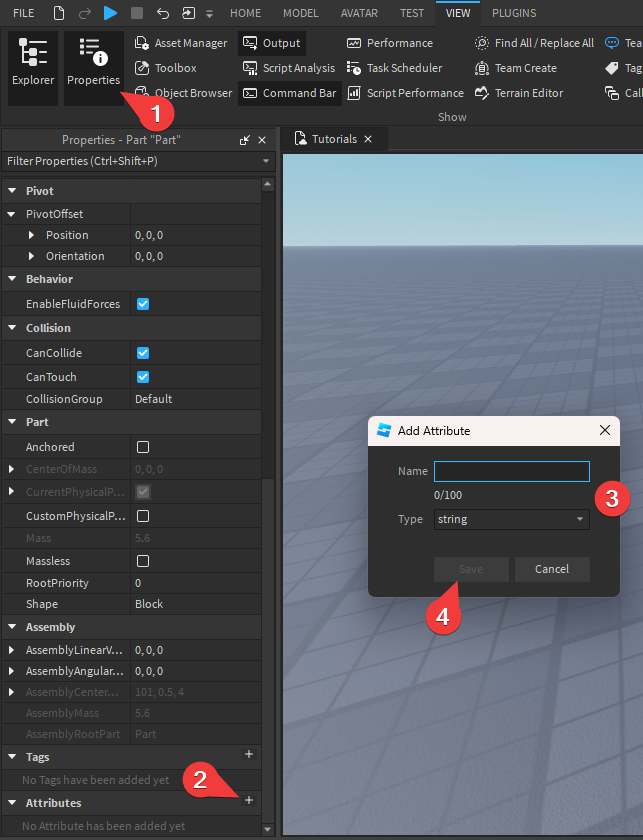 You can add attributes to instances by opening the Properties window, selecting the thing you want to add an attribute to, and scrolling to the very bottom of the Properties window. Press the + button next to Attributes and insert the name and type required by that attribute (both of those are always provided)