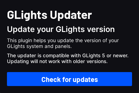 The updater allows you to easily update your GLights to the newest version. It supports updating from GLights 5 to GLights 6 and updating between GLights 6 versions.