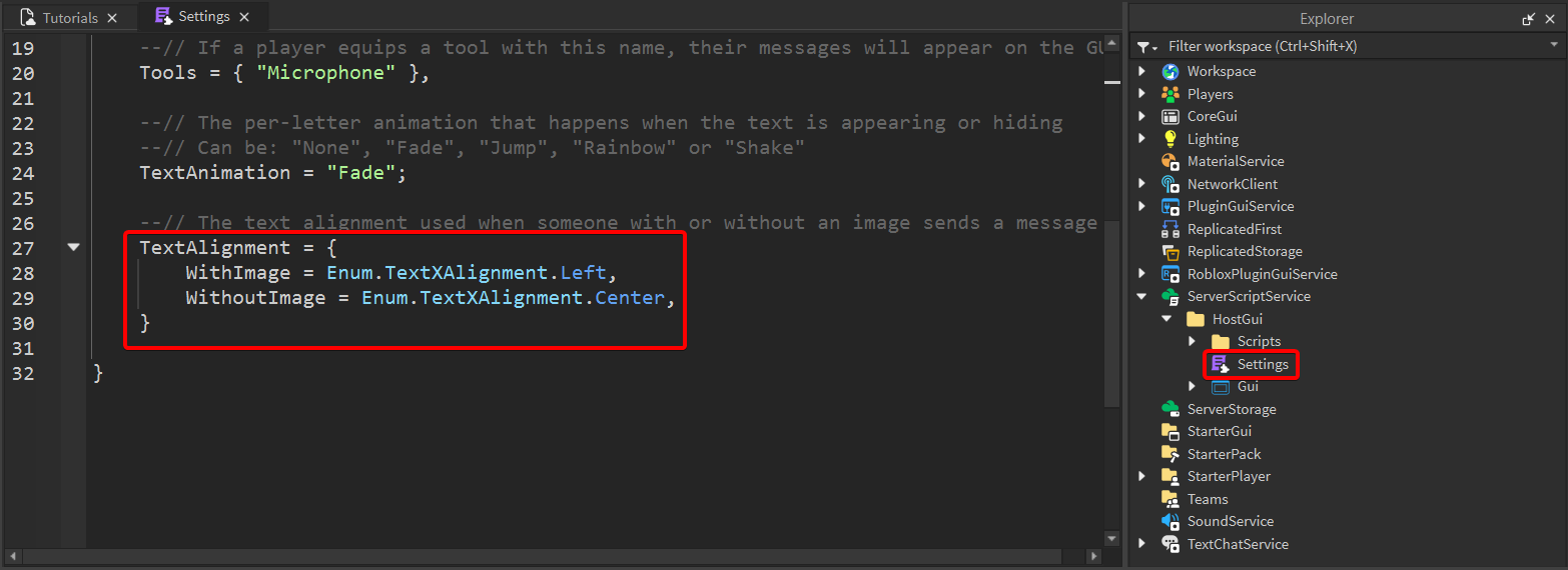To edit the alignment, open the HostGui and double click the Settings script. Locate the TextAlignment setting, it should be at or around line 27.